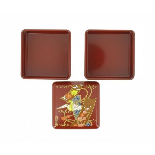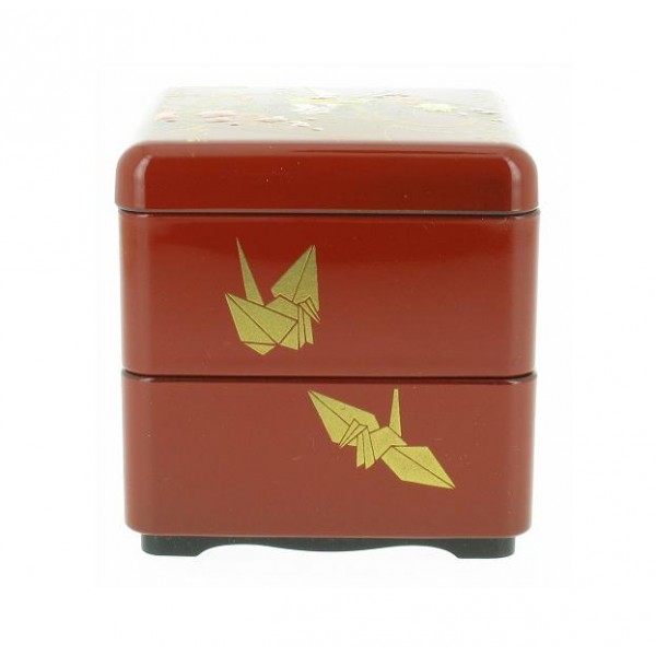 Hako, petite boite laquée rouge décorée, cubique 6,4 cm, 2 compartiments