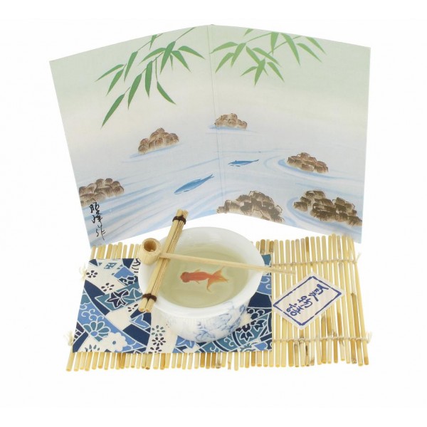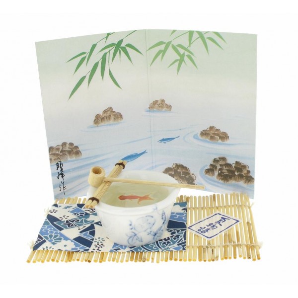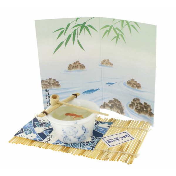 Tout ce qu'il faut pour reconstituter une scène japonaise. Un tsukubai (mini bassin), avec une carpe japonaise et le décor en bambou, bois et papier qui va avec. Taille mini mais charme maxi.